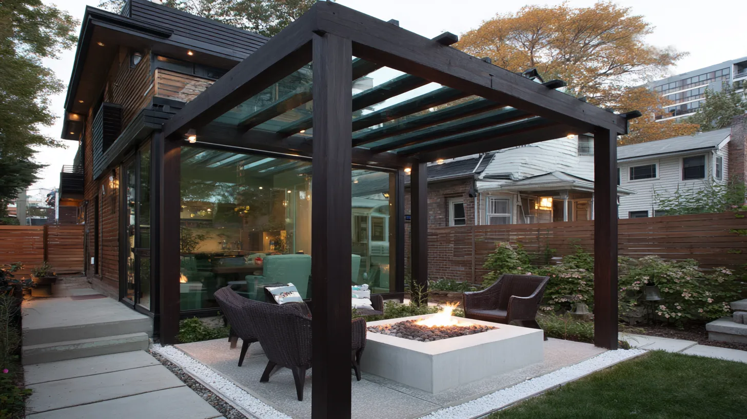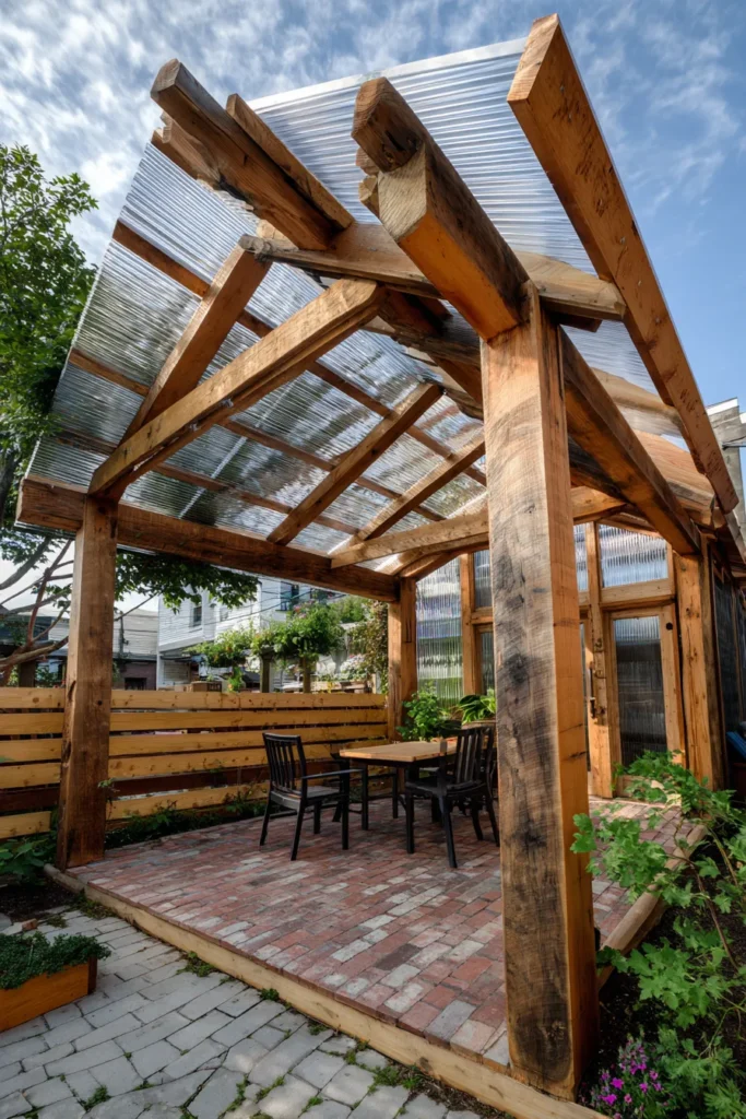 This pergola blends rough-hewn wooden beams with a clear corrugated roof that lets in light while keeping the space usable in any weather. A red brick floor grounds the setup, while simple black chairs keep the look sleek and practical.