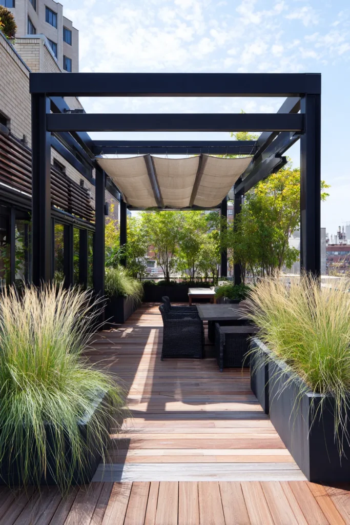 This pergola design features a bold black frame with a fabric canopy stretched across the top. Tall planters filled with ornamental grasses bring softness, while clean lines make the space feel structured and polished.