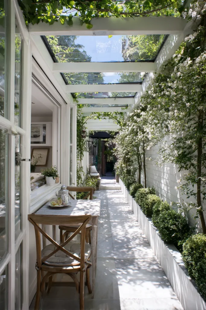 This slim white pergola hugs the side of the home, with glass panels in the roof and climbing greenery along the wall. Potted boxwood and flowering vines create a fresh, airy feel, while a small table makes the walkway double as a sitting area.