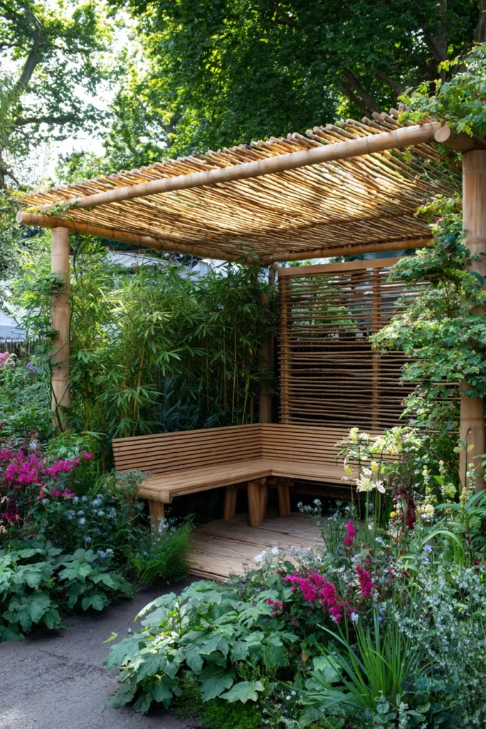 This design uses bamboo poles for both the frame and slatted roof, paired with a built-in corner bench. Surrounded by leafy plants and bright flowers, it has a tropical, spa-like feel that invites relaxation.
