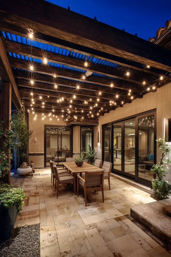 This pergola is built with rich wooden beams and dressed up with string lights that glow warmly at night. The stone patio below holds a simple dining table, making the whole area feel like an outdoor extension of the living room.