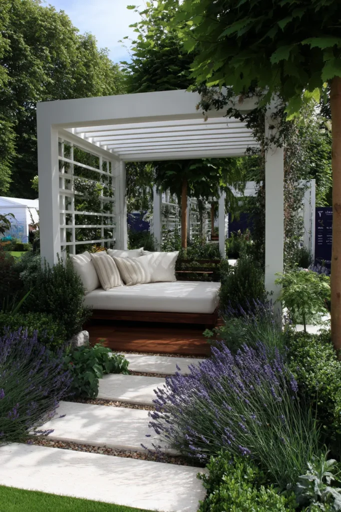 This pergola shows off clean white lines with a built-in daybed that feels like the ultimate outdoor nap spot. Surrounded by lavender and lush greenery, it creates a pocket of calm that feels both stylish and restful.
