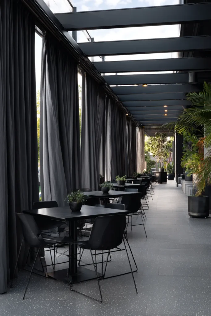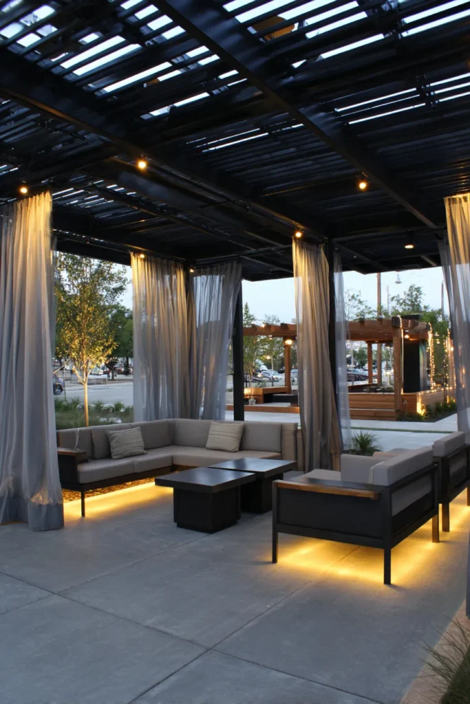 A long steel pergola stretches beside a sleek patio. Deep charcoal curtains line the edge and add a dramatic sweep. Black tables and chairs continue the palette. Subtle canopy lights dot the structure for evening shine.