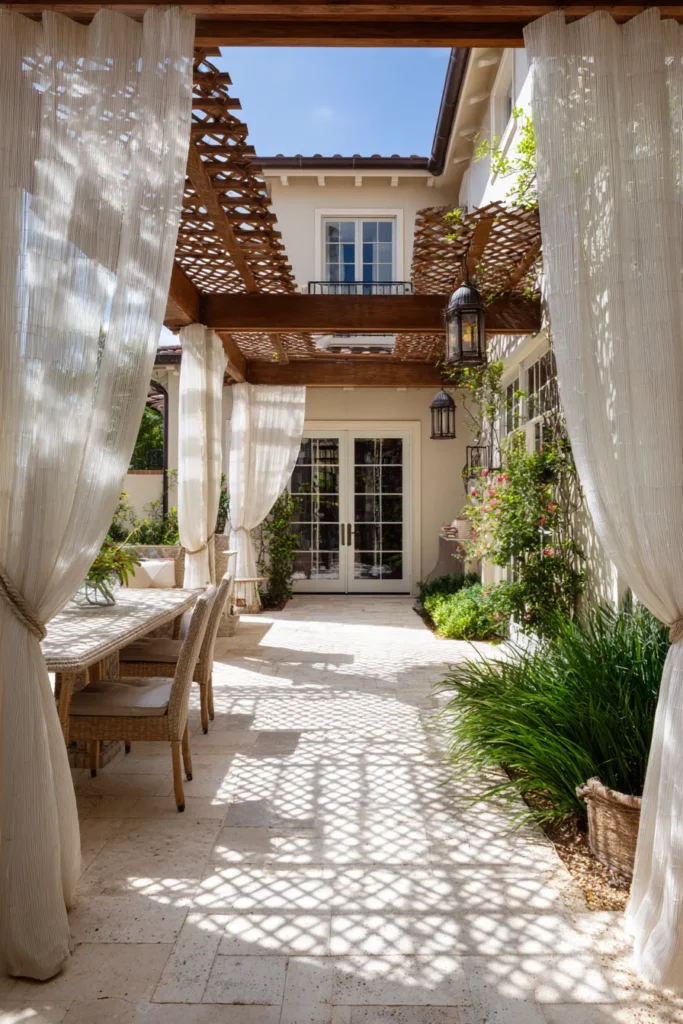A wood pergola with lattice panels throws pretty shadows across travertine pavers. Sheer ivory curtains gather at rope ties and skim the floor. Rattan dining chairs and a long table promise slow lunches. Climbing vines and lantern pendants add soft romance.