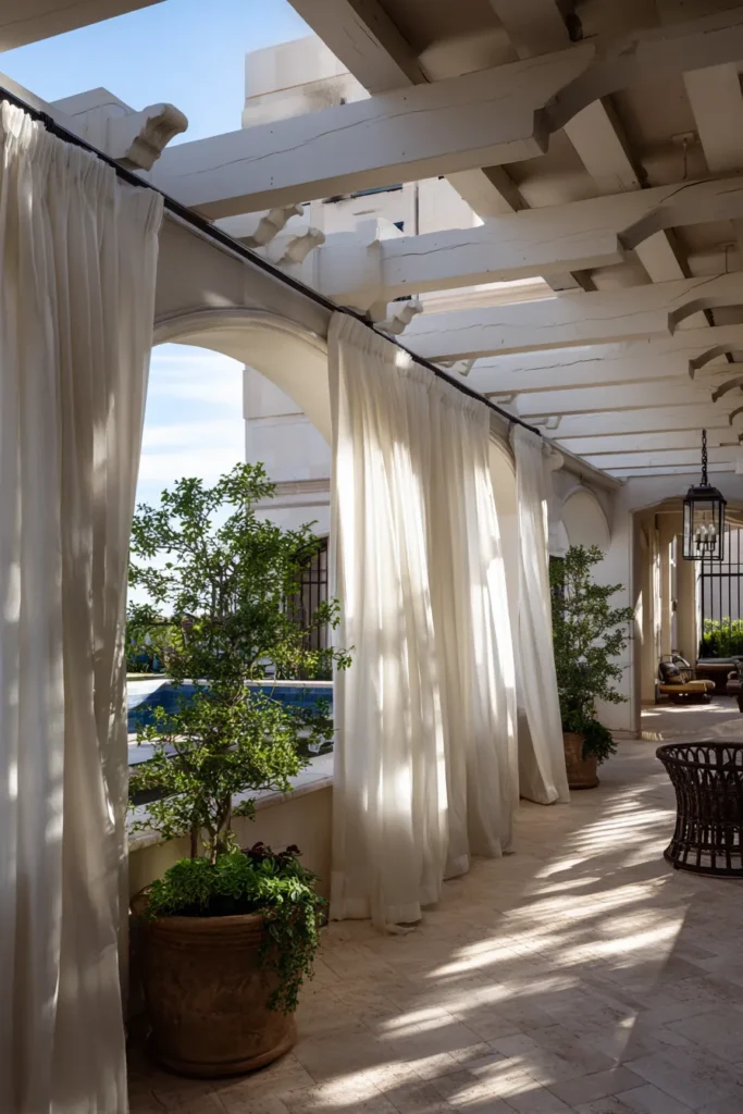 A painted pergola runs along a row of arches and frames views to a blue pool. Cream curtains hang in full panels and glide along a discreet track. Terracotta planters bring green to the pale stone floor. Lanterns repeat down the corridor for gentle glow.