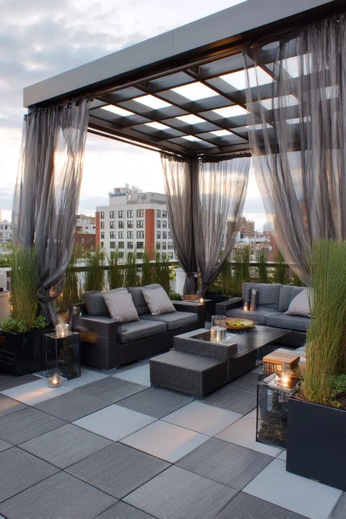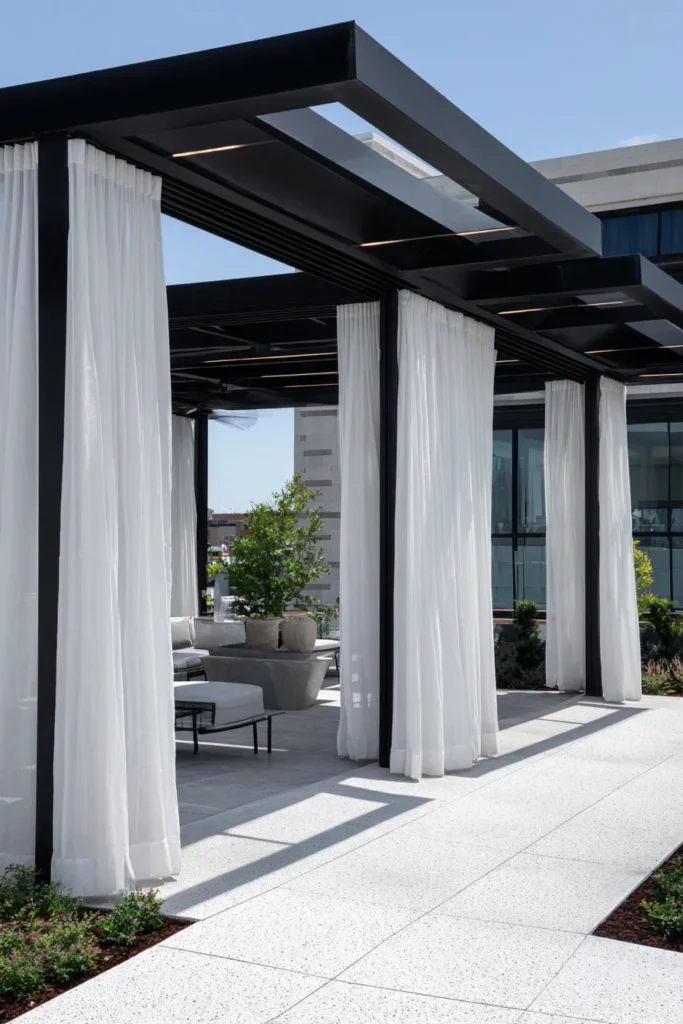 A sleek black pergola defines a modern rooftop. Tall sheer panels soften the strong lines and move with the wind. Low lounge furniture and chunky planters keep the palette calm. Slim inset lights trace the beams overhead.