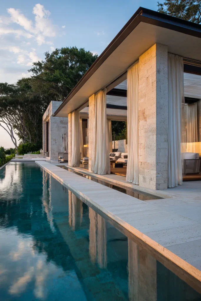 Monolithic stone columns support a long pergola beside a serene lap pool. Cream drapes drop from concealed tracks and pool gently at the base. A walkway skims the water and links open living zones. Warm light washes the stone at dusk.