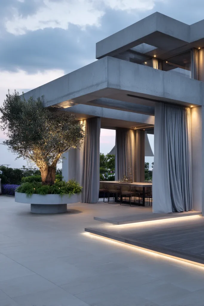 Structural concrete frames create deep outdoor rooms. Smoky gray drapes gather within each bay and hide neatly when open. Uplighting grazes the surfaces and a lit planter cradles an olive tree. A long dining table anchors the scene.