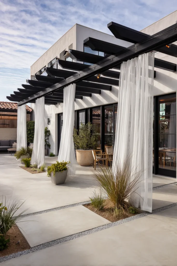 Dark beams extend from a modern house and shade a wide patio. Airy white sheers hang between posts and sway above sculptural planters. Concrete pavers step through grasses for texture. Outdoor dining and lounge spots keep the layout flexible.