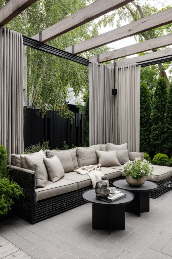 A compact pergola wraps a corner lounge with deep seat cushions. Thick taupe curtains stack on ceiling tracks and frame tall evergreens. Exposed rafters add texture above. Matte black tables and accents keep the palette grounded.