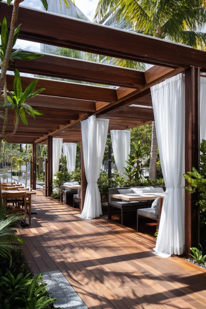 Rich wood beams line a boardwalk through lush planting. Sheer white curtains divide open cabanas with built in seating. Sunlight filters through clear roof panels and dances on the deck. Dining nooks mix with lounge bays for an easy resort rhythm.