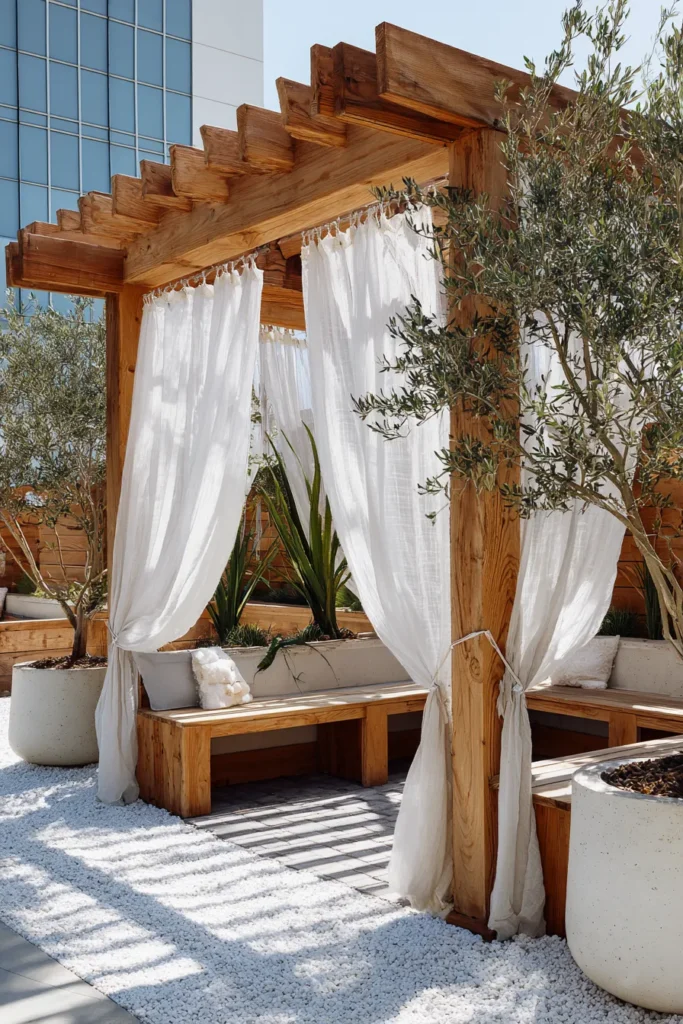 A warm cedar pergola frames built in benches and slim planters. Sheer white curtains hang from a simple track and tie softly at each post. Olive trees in oversized pots add silvery green. White pebbles brighten the ground and bounce light into the cozy corner.