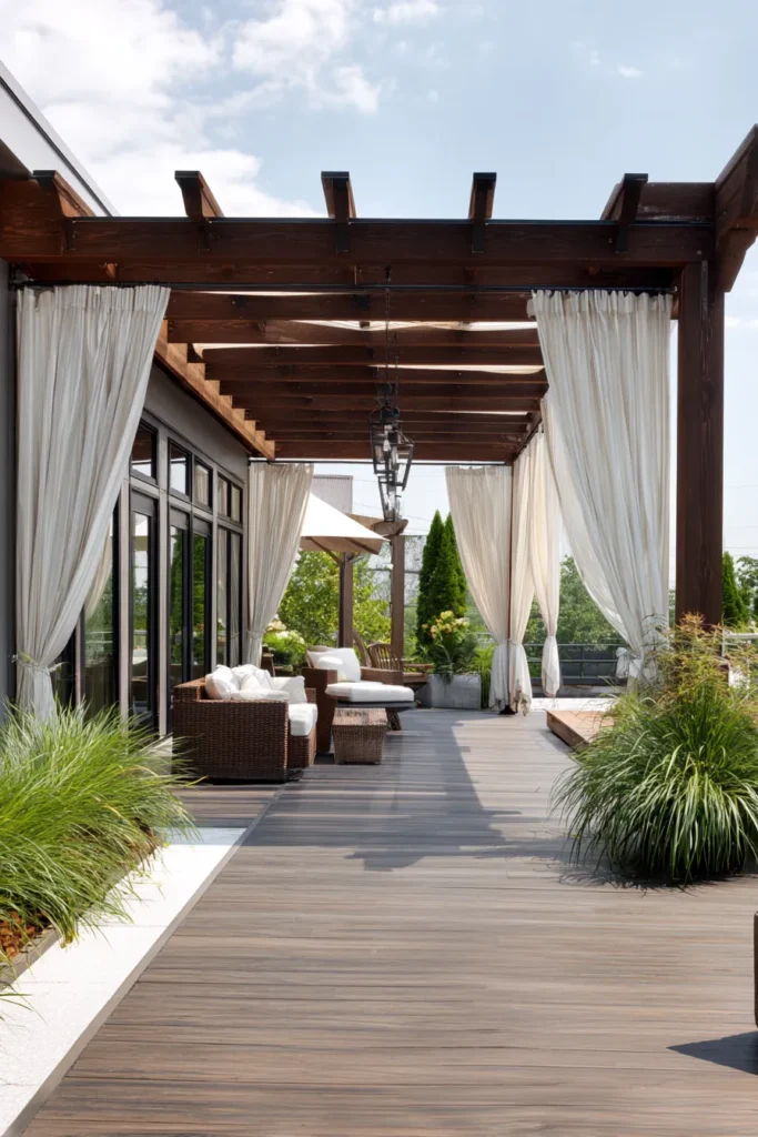 A dark stained pergola stretches along a generous deck. Cream curtains fall in relaxed folds and tie neatly at the posts. Woven chairs and white cushions keep the setting casual. Lantern pendants add a hint of glow down the center.