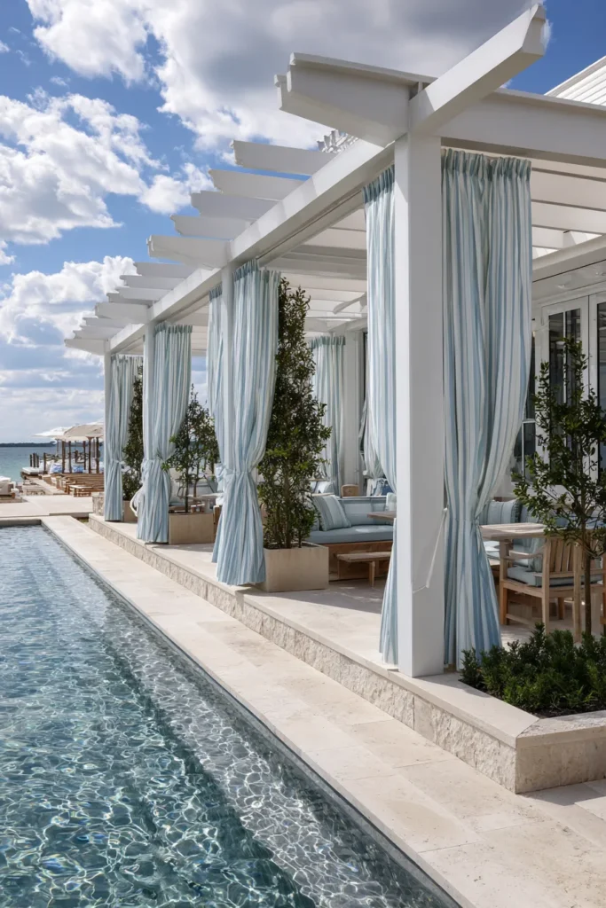 A crisp white pergola lines the pool with classic blue and white striped curtains. The panels gather at each column and open to cushioned lounge seating. Pale stone paving keeps everything cool. Slim evergreens in planters add height and a resort vibe.