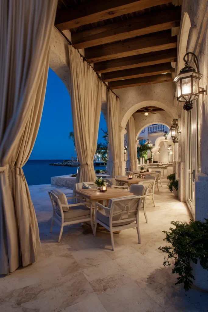 Arched openings frame a waterfront view while a wood ceiling adds warmth. Creamy curtains gather at limestone columns and pool on the floor. Lanterns glow along the walkway. Petite dining tables make it a dreamy outdoor salon.