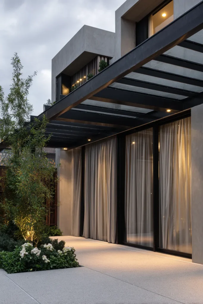 A slim black steel pergola extends from a modern facade. A glass like roof filters light while tall sheer curtains soften the wall of windows. Subtle uplights wash the paving. Lush planting tucks into the corner for contrast.