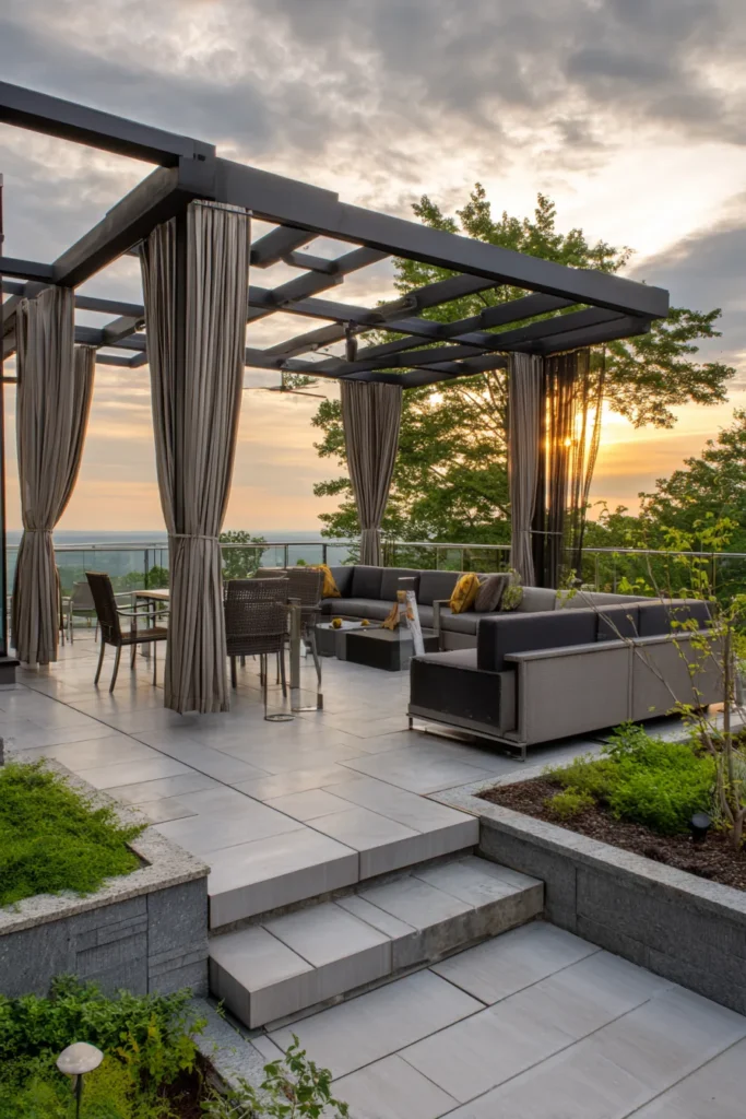 A roomy terrace holds a metal pergola with neat grid beams. Tall taupe curtains slide on tracks and tie back to reveal views over the trees. Modular sofas and a dining set create zones. Large tiles keep the look clean and easy.