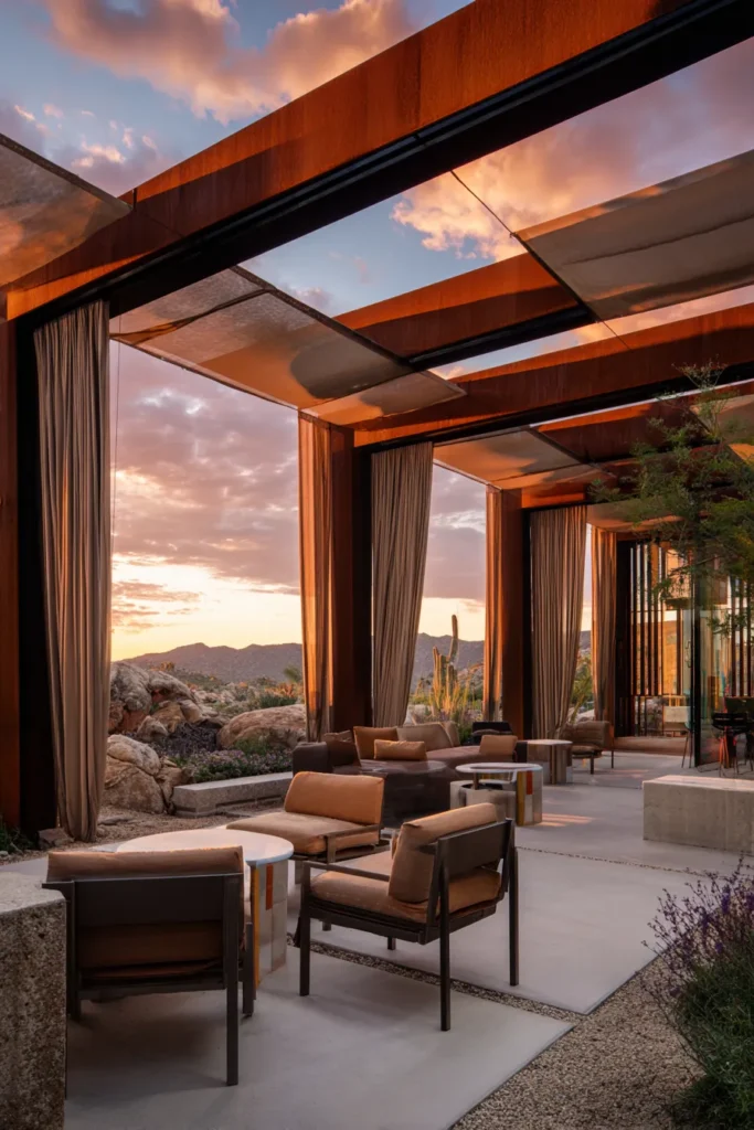 Weathered steel columns rise against the desert hills. Warm drapes stack between bays and soften the architecture. Retractable panels temper the sun. Low lounge chairs and stone tables echo the rugged landscape.