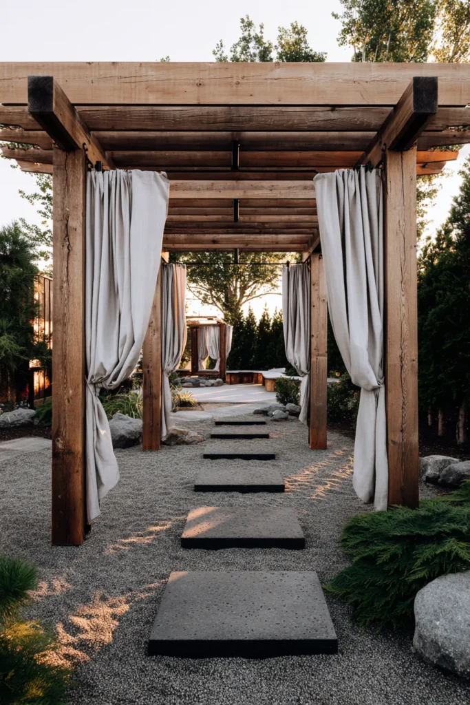 A series of chunky wood frames creates a garden walkway. Natural linen curtains gather at each post and soften the rhythm. A gravel bed holds bold stepping stones. Evergreens and boulders frame the path with texture.