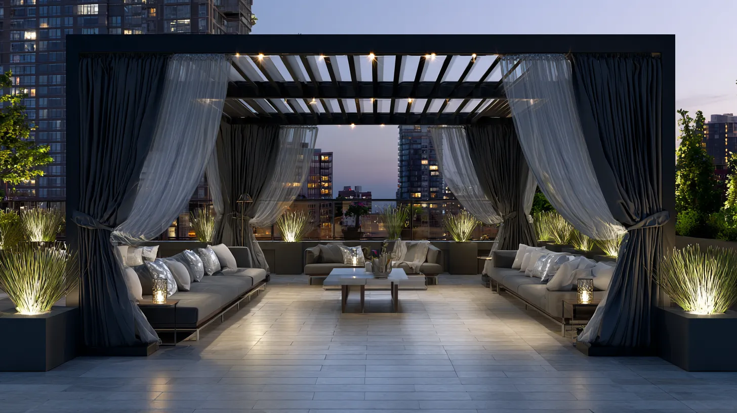 A sleek black pergola defines a modern rooftop. Tall sheer panels soften the strong lines and move with the wind. Low lounge furniture and chunky planters keep the palette calm. Slim inset lights trace the beams overhead.
