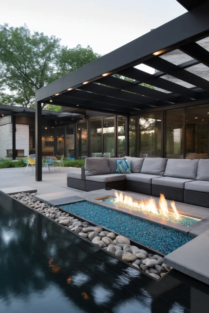 I’m obsessed with how this design masterfully merges fire and water in one ultra-chic setting because it’s so unexpected and truly elevates the whole outdoor vibe. The dark framework of the pergola really pops against the softer textures of the cushions and the glow of the fire and it just screams high-end relaxation after a long week.