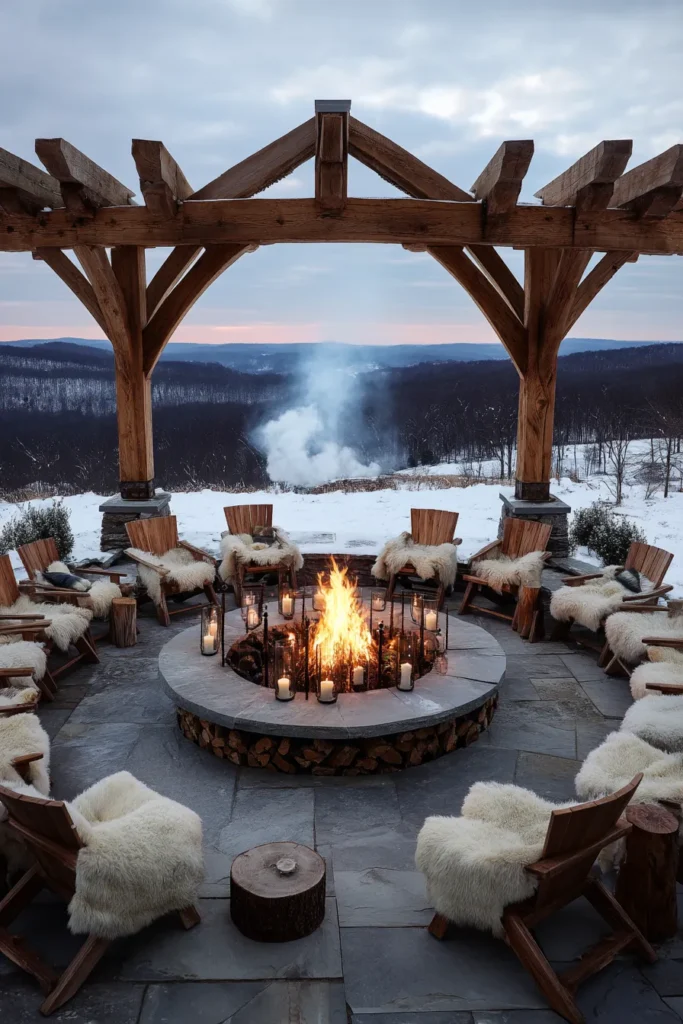 This incredibly warm and inviting scene is the ultimate mountain or winter retreat, featuring a robust, chunky timber pergola that provides a grand frame over a circular fire pit. The enormous stone-ringed fire pit is surrounded by comfortable, weather-proof chairs and plush pillows and throws, suggesting a space designed for gathering even when there’s snow on the ground. The entire area is set on a solid stone patio, creating an absolutely perfect spot for enjoying a fireside chat with a view.