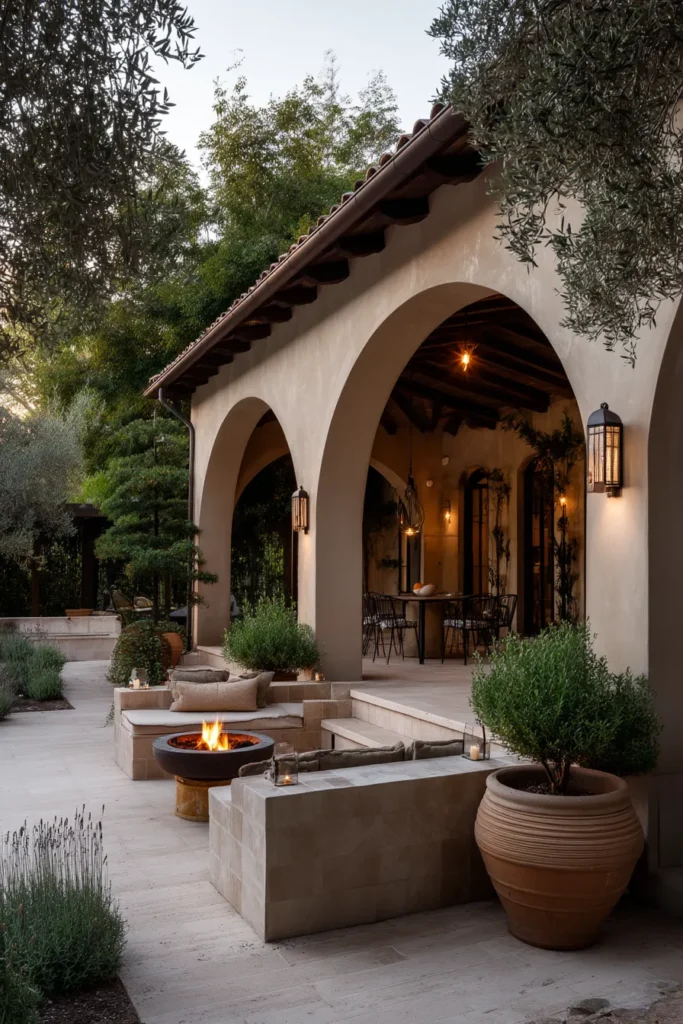 What captivates me about this space is the undeniable old-world charm and romance of the arched architecture and the lovely stucco finish which is so evocative of classic European design. I think it’s a wonderful idea to use a smaller, portable fire pit here because it adds that essential cozy glow without distracting from the stunning structure, making it ideal for intimate al fresco dinners.