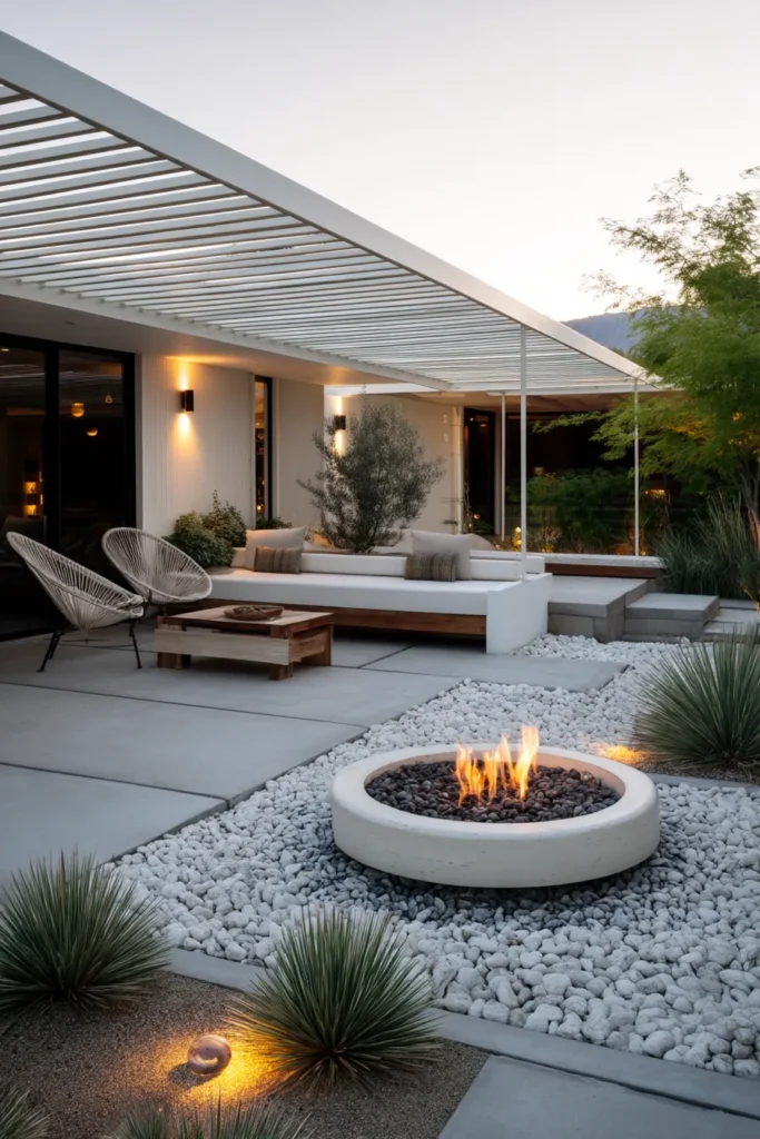Modern White Pergola with a Minimalist Fire Bowl