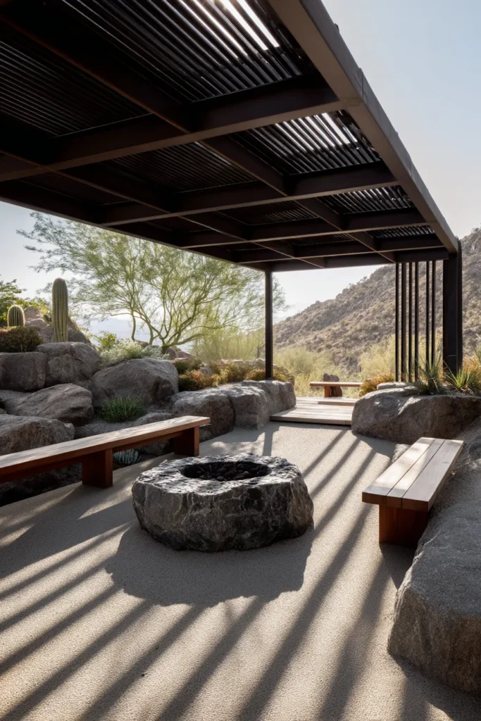 Desert Retreat Pergola with Natural Stone Fire Pit