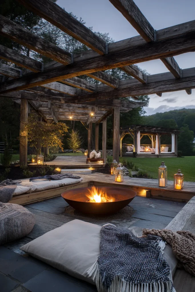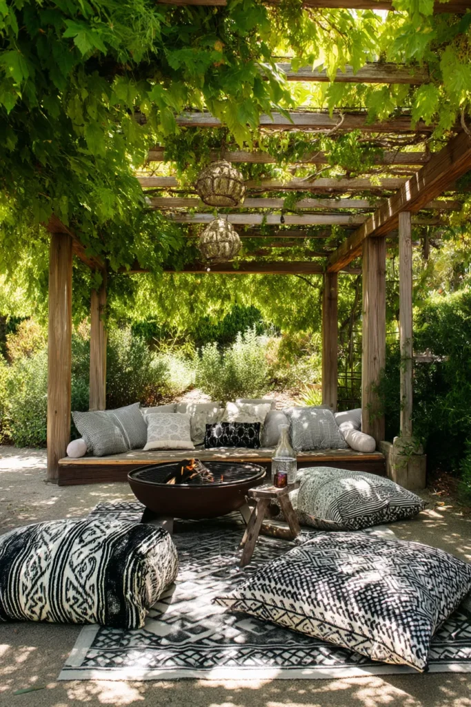 Talk about atmosphere! This enchanting design features a rough-hewn, rustic wood pergola draped with climbing vines, creating a charming, sheltered space. Underneath, a comfortable conversation area is defined by large, floor pillows and throws centered around a substantial, circular weathered steel fire bowl. The combination of the distressed wood, the lush greenery, and the cozy textiles gives this spot a magical, truly bohemian feel.