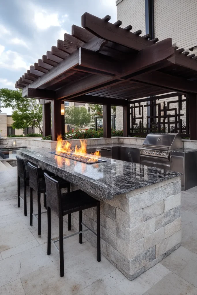 This sophisticated outdoor living space is a dream for the ultimate entertainer, featuring a grand, dark wood pergola covering a full-service bar area with tall stools. The main event is a massive, built-in rectangular fire pit with a substantial stone hearth that doubles as a serving area. The entire setup is grounded by beautiful, light stone paving, giving this space a formal and highly functional feel that’s perfect for hosting big parties.
