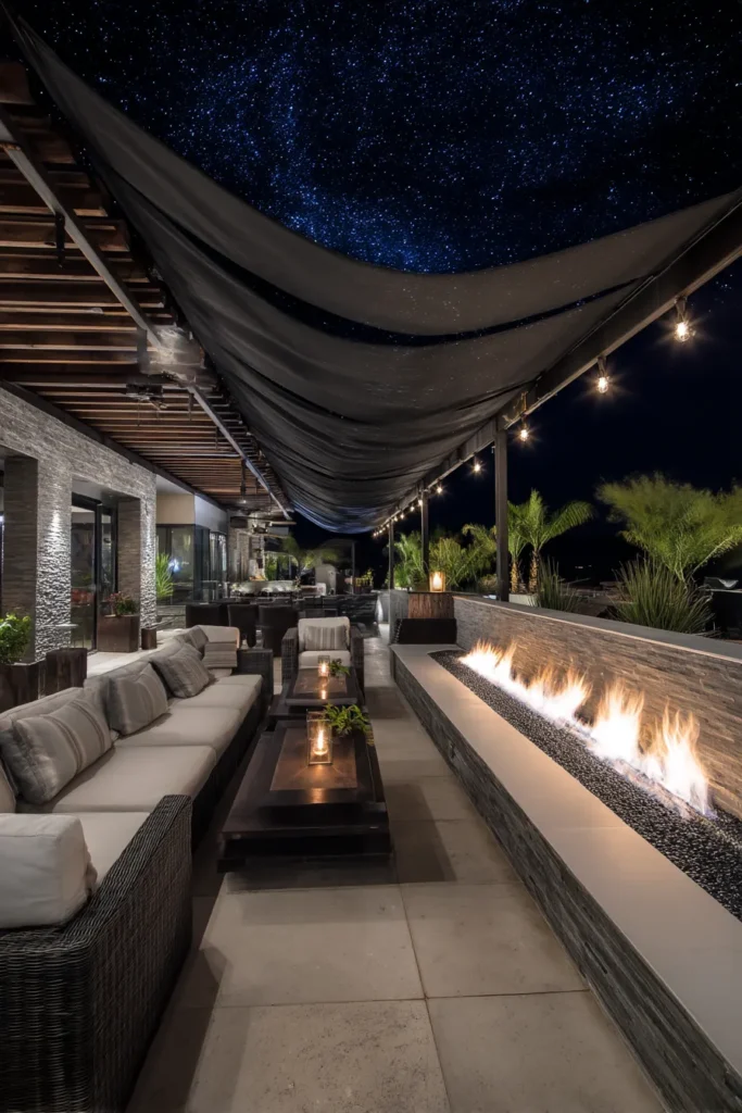 This dramatic outdoor space is built for elegant nighttime gatherings, featuring a long, contemporary pergola with a stylish fabric canopy providing soft, filtered shade or a perfect backdrop for string lights. The seating area is composed of a long, tiered bench with plush cushions, creating a stadium-like effect that focuses on a long, sleek, recessed fire pit. The subtle lighting and the starry sky complete the picture, making it feel like a truly luxurious, private retreat.