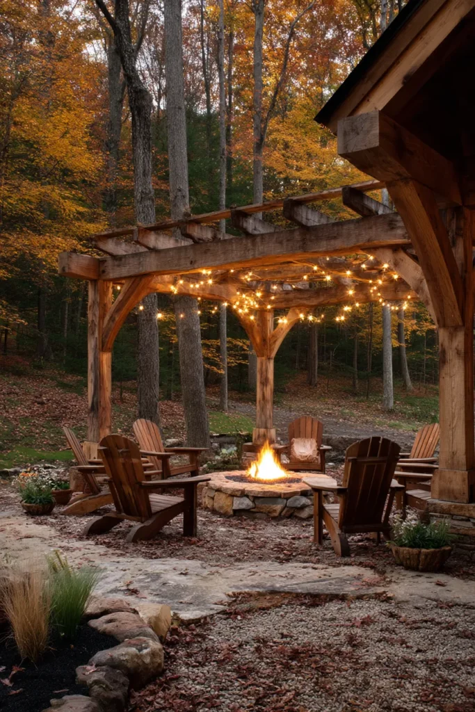 I am completely charmed by how incredibly cozy and dramatic this whole setting feels and it truly captures the spirit of a lodge getaway. The heavy, natural wood of the pergola is so grounding and I just love the simple yet perfect circular arrangement of the seating because it encourages genuine conversation and that true feeling of togetherness.