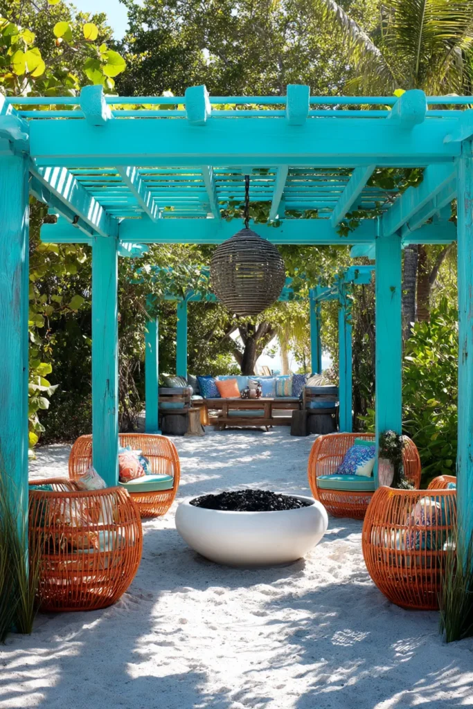 This vibrant outdoor sanctuary is bursting with bold, joyful color starting with the striking electric teal pergola that dominates the space. Underneath the bright structure is a cozy grouping of wicker chairs with playful orange cushions surrounding a smooth, white bowl-style fire pit. The look is completed with lush greenery all around and a unique hanging lantern, creating an irresistible tropical resort feel that’s perfect for sunny days and warm evenings.