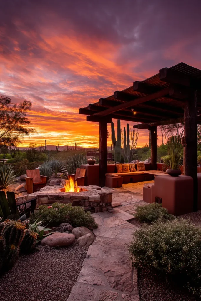 This dramatic design captures the beautiful, rugged spirit of the Southwestern desert, especially with that incredible sunset backdrop! The pergola is made of dark wood, providing shelter over an integrated seating area crafted from warm, reddish adobe or stucco. The benches surround a gorgeous, organic stone fire pit that blends perfectly with the rocky, arid landscaping. The whole space feels incredibly grounded, private, and utterly magical, particularly at dusk.