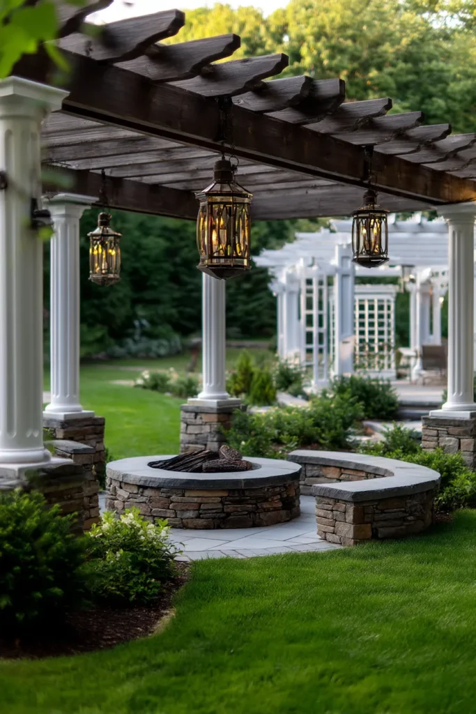 This elegant design offers a timeless, traditional garden feel, featuring a dark wood pergola supported by beautiful, stately white columns. The pergola frames a cozy, circular conversation area set within the lawn, which is defined by a low, curved stone retaining wall. A rustic stone fire pit is the focal point, and the whole scene is finished with gorgeous hanging lanterns that cast a warm, inviting glow over the lush green landscaping.