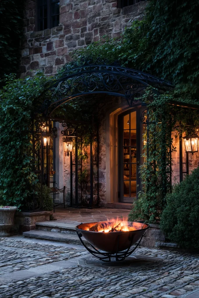 This incredibly romantic design feels like it belongs to a hidden European villa, with an intricate, arched wrought iron pergola creating a beautiful entrance over a stone-paved courtyard. The space is illuminated by warm, lantern-style wall sconces that highlight the rustic stone facade of the home. The fire pit is a striking, contemporary metal bowl set on a cobbled patio, offering a sophisticated contrast to the old-world architecture.