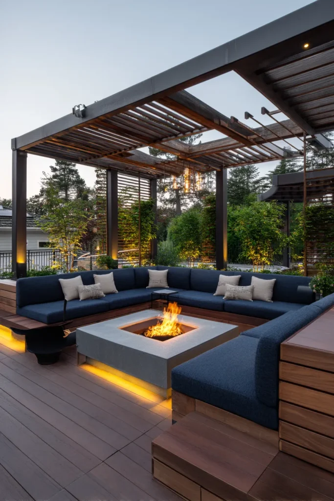 Here is a beautiful example of a luxurious outdoor lounge featuring a rich, warm wood pergola casting lovely shadows over a built-in seating area. The deep navy cushions create a sophisticated contrast against the wooden deck and the glowing, modern square fire pit built right into the center of the pit. Integrated accent lighting under the benches adds a gorgeous evening glow, making this space feel incredibly welcoming and perfect for entertaining a big group of friends.