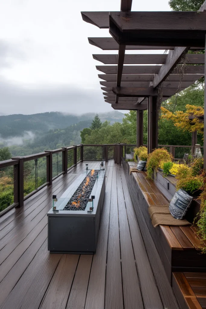 This amazing design features a long, narrow deck with a beautiful wood pergola overhead that appears to float right over a stunning, expansive view of rolling hills. The space is perfect for enjoying the scenery with built-in wooden bench seating lining the edge, all centered around a sleek, rectangular fire pit with a glass wind guard. The combination of the warm wood tones and the simple, modern concrete fire element creates a cozy yet chic atmosphere that’s all about enjoying the great outdoors.