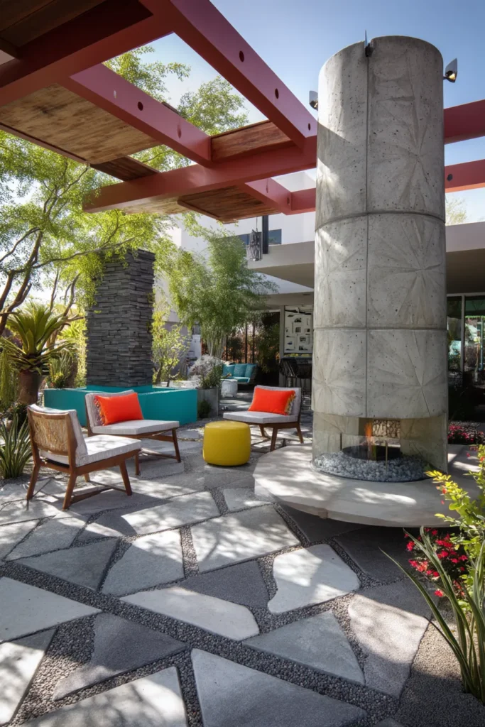 Talk about a statement piece! This unique outdoor room showcases a bold, structural red pergola that provides a striking frame for an incredibly dramatic, towering stone chimney and circular hearth fire pit. The patio floor is a mosaic of different gray and white stones and concrete pavers, surrounded by bright, colorful furniture and lush plantings that give the whole area an artistic, almost Mediterranean feel with a modern twist.
