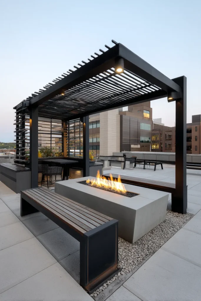 This elegant rooftop design is the definition of chic city living, featuring a dark, slatted metal pergola that defines the outdoor space beautifully. The centerpiece is a clean, low-profile concrete fire pit flanked by a long, integrated bench on one side and cozy, modern chairs on the other. The neutral gray tones of the decking and walls keep the focus on the structure and the warmth of the fire, making it a sophisticated, minimalist haven high above the buildings.