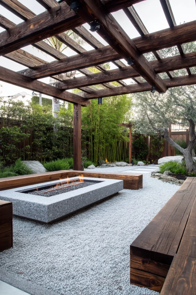 pergola provides filtered light over a patio area covered in light gravel, where a long, low concrete-and-stone fire pit takes center stage. Bench seating is integrated into the landscaping using the same warm, chunky wood as the pergola, surrounded by tall bamboo and olive trees for a feeling of secluded calm.