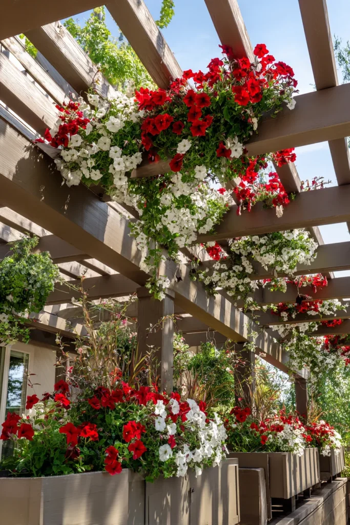 This pergola is a fabulous example of how to achieve maximum color impact using integrated planting. The structure is built from sturdy wood beams stained a lovely medium brown, giving it a warm, inviting feel that complements the house nicely. The genius of this design is the use of built-in planters along the railing and clever linear planters attached to the roof beams themselves. These containers are overflowing with a vibrant mix of cascading red and white petunias, creating a stunning floral ceiling and privacy screen that is just bursting with life and cheerfulness.