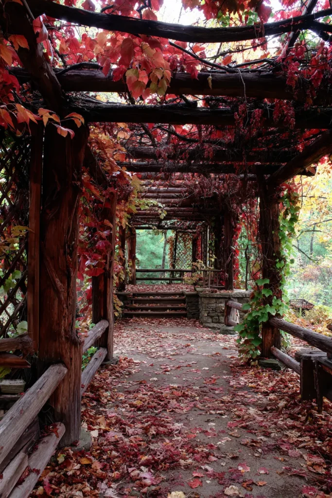 I am absolutely swooning over the cozy, dramatic atmosphere this pergola creates—it’s like stepping into a beautiful, moody painting. The way those colorful leaves just cascade and cover every part of the structure is so inspiring, proving that vines can give you a completely different, gorgeous look every single season. It feels like the most perfect, secret spot for quiet contemplation or maybe even a stunning fall wedding photo shoot. This design gives me major inspiration to let a vine run completely wild and celebrate that gorgeous, rich autumn color palette.