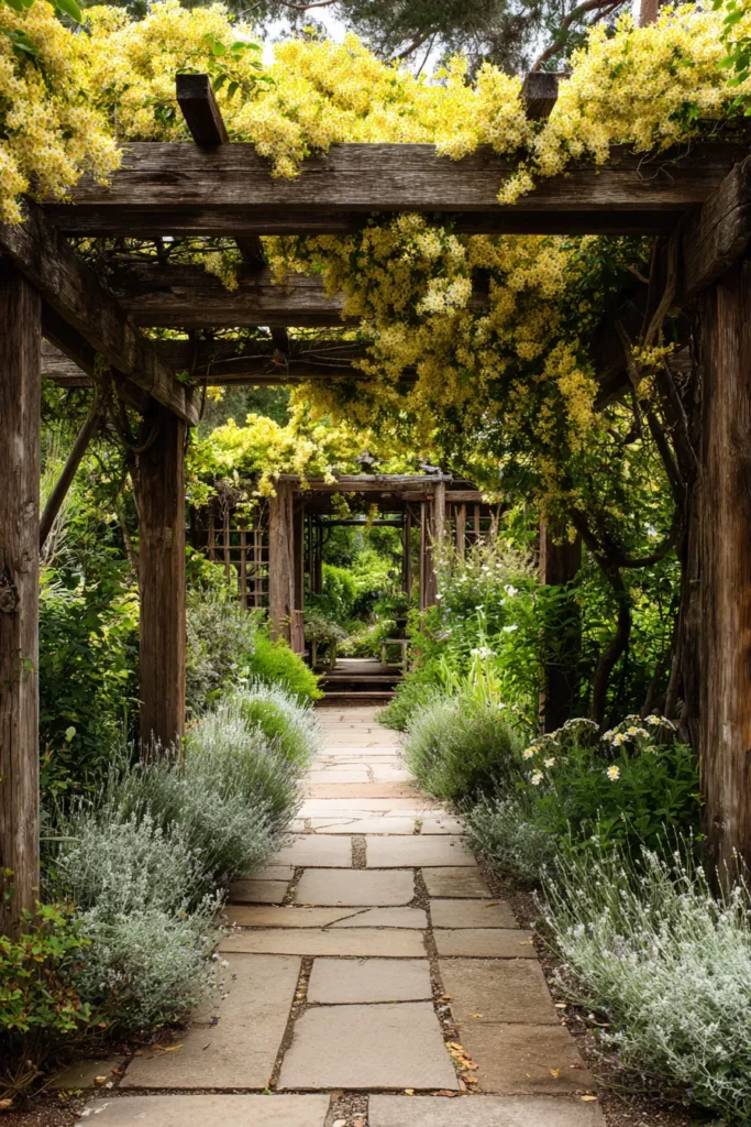 This pergola acts as a gorgeous garden gate or archway, defining the transition into a secluded part of the yard. It’s constructed from substantial, naturally aged wood with a weathered, gray-brown patina that feels incredibly organic and established. The structure is beautifully crowned by a dense cascade of bright yellow flowers, likely a stunning Wisteria or a similar vigorous vine, creating a sunny, fragrant welcome. The arch frames a flagstone path lined with lovely, silvery lavender plants, drawing the eye inward toward the next cozy garden space nestled in the background.