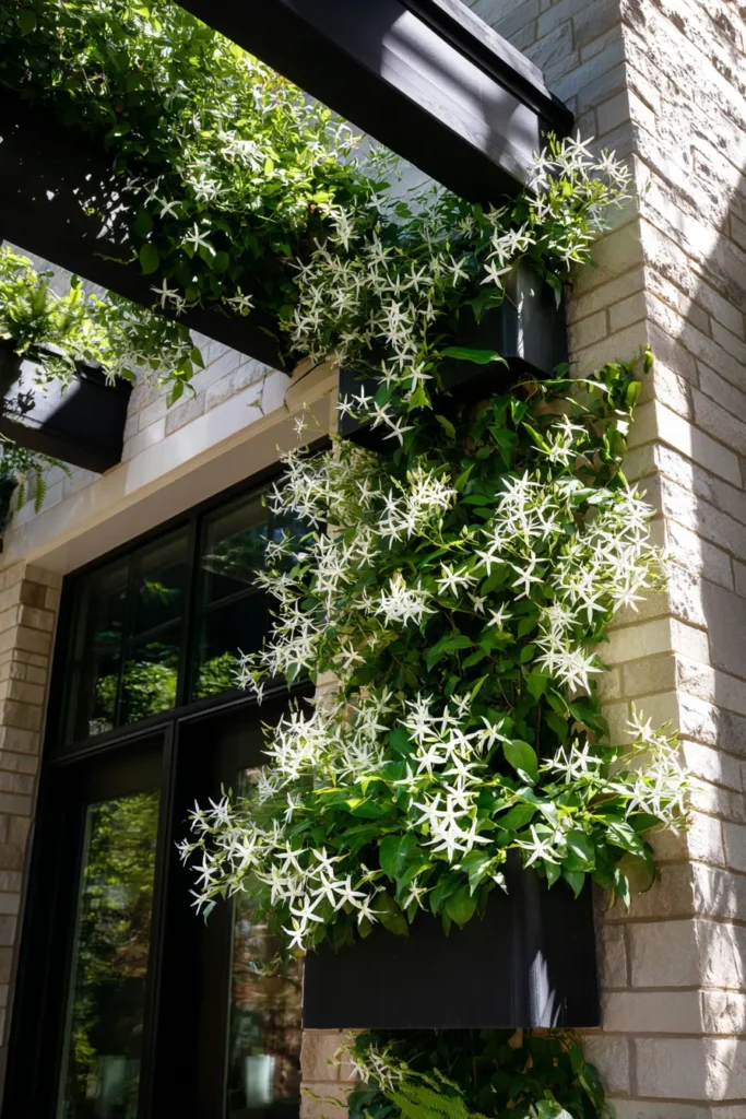 I think this design is absolutely brilliant because it’s a perfect solution for adding that beautiful vine look to a small space without needing to plant directly into the ground. The clean lines of the black metal feel so contemporary and chic, making the whole setup look incredibly high-end and intentional. And honestly, imagine stepping outside and being greeted by the sweet, gorgeous fragrance of Star Jasmine every morning—it truly turns a simple corner of the house into a fragrant, flowery paradise. This is a must-save idea for anyone with a modern home who still loves that lush garden vibe!