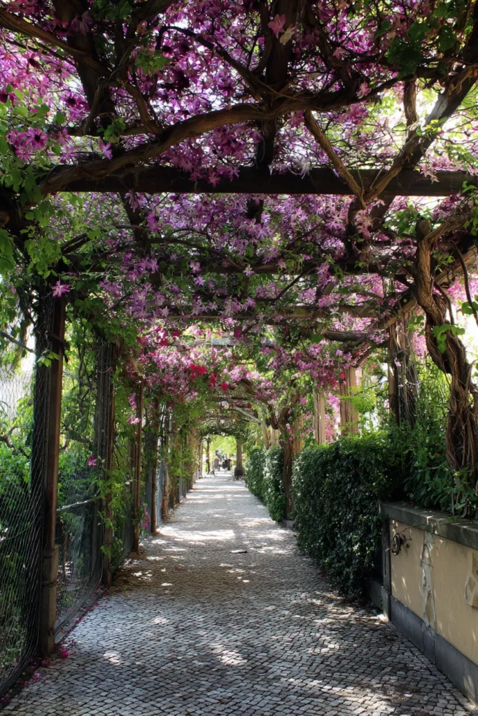 This long, breathtaking pergola creates an unforgettable walkway tunnel that feels like a trip straight to a European garden estate. The structure uses rustic, substantial wood beams, now beautifully aged and covered in thick, gnarled vine trunks that give the whole aisle incredible character. The overhead canopy is bursting with lavender and magenta flowers, likely a glorious Clematis or Wisteria, that completely drapes the roof and filters the sunlight into a romantic pattern of dappled shade over the cobblestone path. The sides feature a mix of neatly trimmed ivy and climbing vines, adding privacy and a gorgeous sense of enclosure.