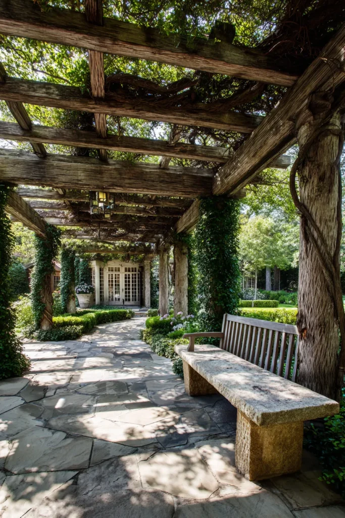 This is an elegant, timeless pergola that feels like it belongs on a gorgeous, sprawling estate. The structure is built using incredibly massive, rough-sawn cedar beams for the roof and large, tree-like wood pillars for the supports, giving it a commanding presence. The pillars are beautifully covered in a dense, dark green vine, likely ivy, while the roof beams are entwined with a looser, leafy canopy, creating perfect dappled shade over the flagstone pathway. A substantial stone bench offers a lovely place to rest, framing the view toward the charming French doors in the distance.
