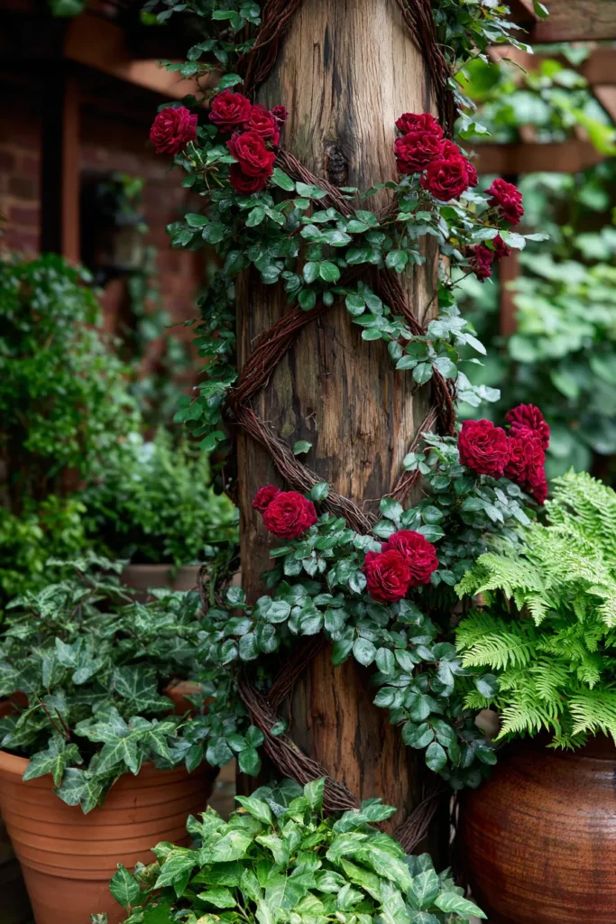 This close-up shot is pure garden romance, focusing on a single, stunning rustic cedar pergola post. The post itself has a beautiful, weathered grain, giving it an authentic, cottage-style appeal. It’s wrapped tightly with thick, artistic twisted vine or twig wreaths that create a textured, diamond pattern up the side. Woven through and around this structure are lush deep crimson climbing roses with rich green foliage, interspersed with other potted greenery like ivy and ferns at the base. It’s an incredibly detailed and textural way to celebrate the support structure of a pergola.
