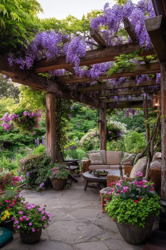 Just look at this enchanting space; it’s an absolute fairytale brought to life. The focal point is a rustic wooden pergola with incredibly thick, natural posts and beams that feel perfectly integrated into the landscape. This structure is absolutely blanketed in lush, trailing purple wisteria that cascades down, creating a stunning, fragrant canopy that allows light to softly filter onto the stone patio below. The setting is a true cottage garden paradise, completely surrounded by vibrant greenery, blooming shrubs in pinks and purples, and large planters overflowing with colorful flowers, making the entire area feel like a secret, magical hideaway.